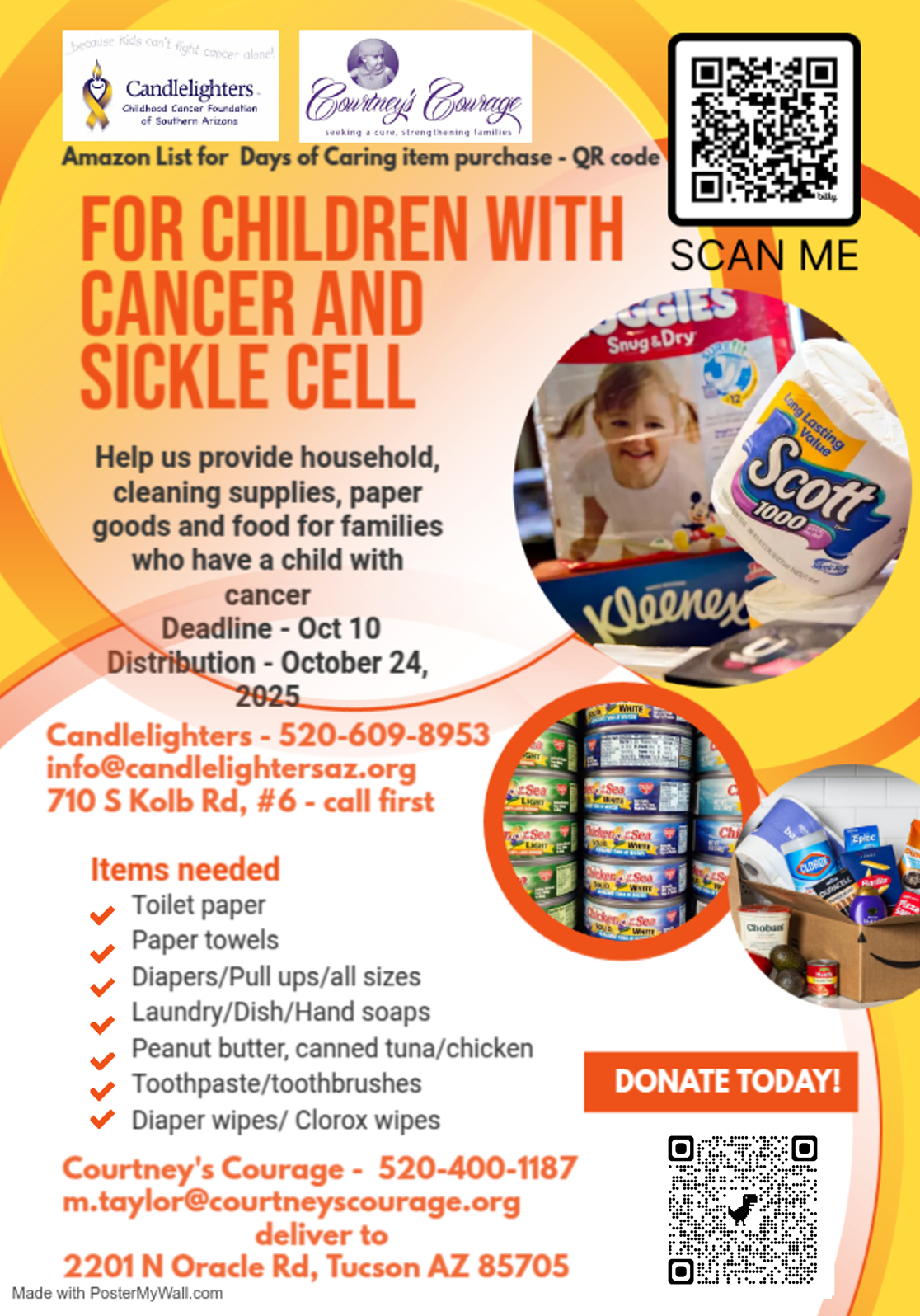 September is Childhood Cancer Awareness Month! Courtney’s Courage and Candlelighters of Southern Arizona are partnering on an Essential Items Even for families on October 24, 2025. We will be collecting and accepting items through Saturday October 10, 2025 to provide to families of children with cancer. Providing these items helps that families to continue to focus on their child with cancer. Essential items include items such as paper towels, toilet paper, tissues, hand soap, toothpaste and toothbrushes, cleaning supplies, disinfecting wipes, etc. See our QR code for an Amazon list of needed items. Thank you to all that have donated.